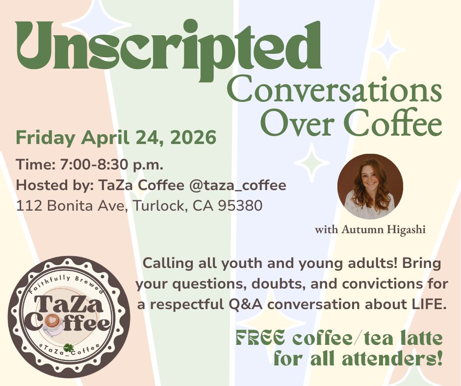 Calling all youth and young adults! Join us on Friday, April 24 for an open Q&A with Autumn Higashi at TaZa Coffee. Bring your questions, doubts, and convictions for a respectful conversation about LIFE.